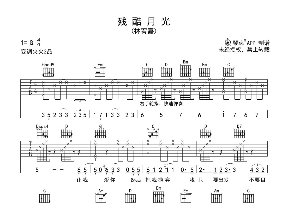 林宥嘉《残酷月光》吉他谱 - G调弹唱六线谱