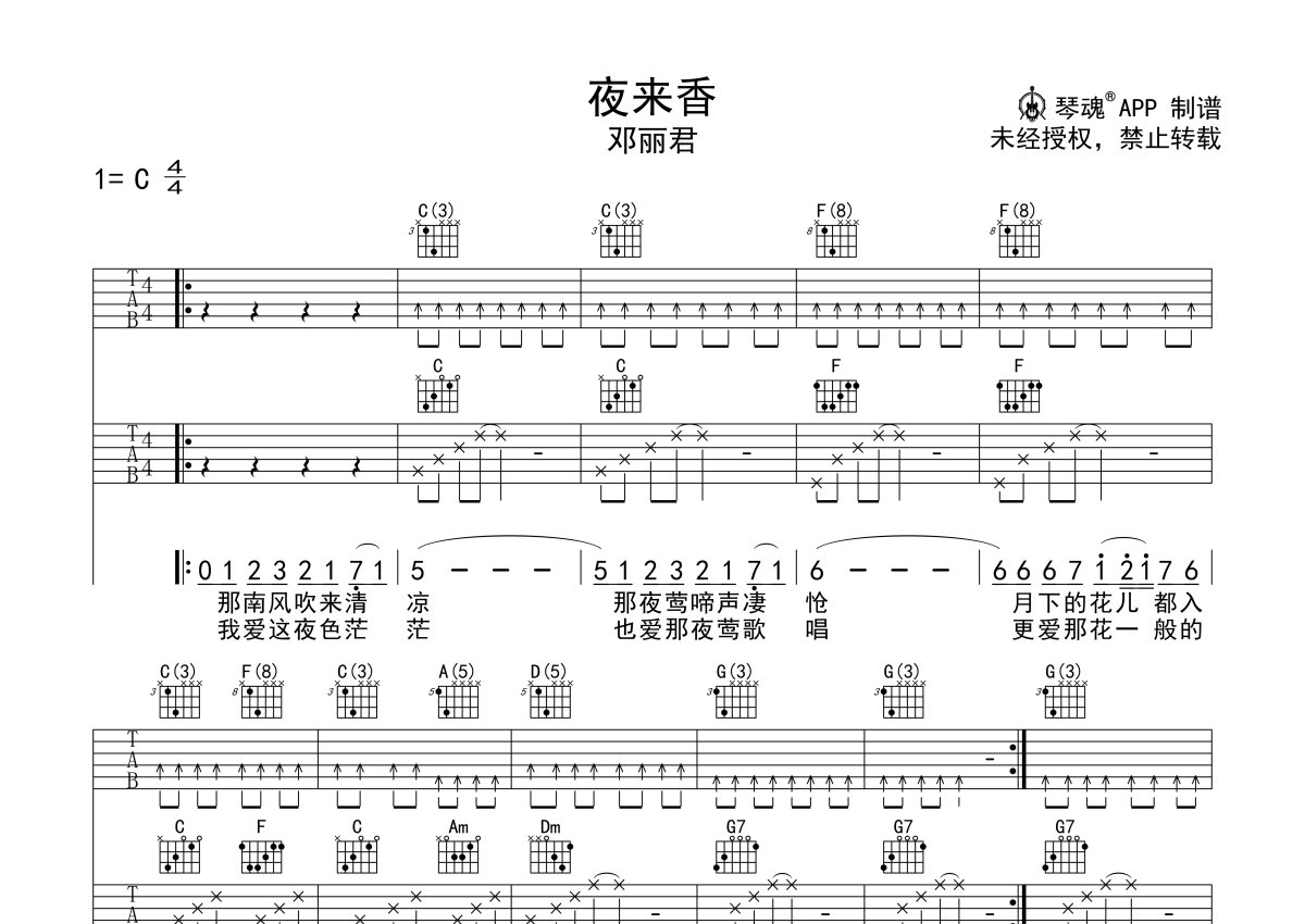 邓丽君《夜来香》吉他谱 - C调弹唱六线谱 - 双吉他版本