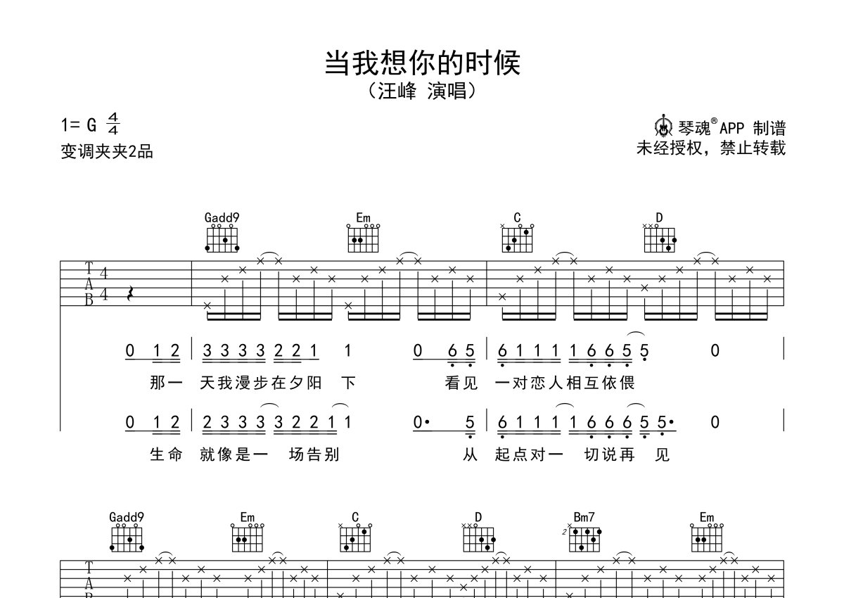 汪峰《当我想你的时候》吉他谱 - G调弹唱六线谱