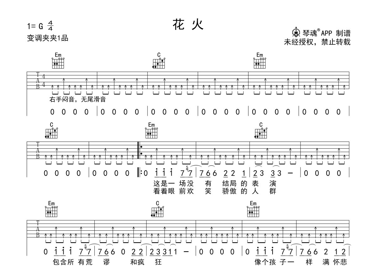 《花火》是汪峰演唱的一首歌曲,本吉他谱采用的是G调指法编配,这份吉他谱共有两张高清图谱,图谱由 @随心谱 编配上传,图谱使用六线谱编配,包含吉他和弦指法、简谱以及歌词部分,使用这份花火吉他谱,可以让你更加方便地掌握这首歌曲的弹唱技巧,快来尝试吧。汪峰的一首歌曲,G调变调夹夹一品。汪峰的男声版本唱出了骨子里的那种孤独寂寞,哀伤迷茫、执着与坚强,中国好声音节目贝贝演唱的这首《花火》则摒弃了原唱的撕裂感,唱出了这首歌阳光的一面,最好的诠释爆裂炽热、力量和美,一如点燃生命璀璨的花火。