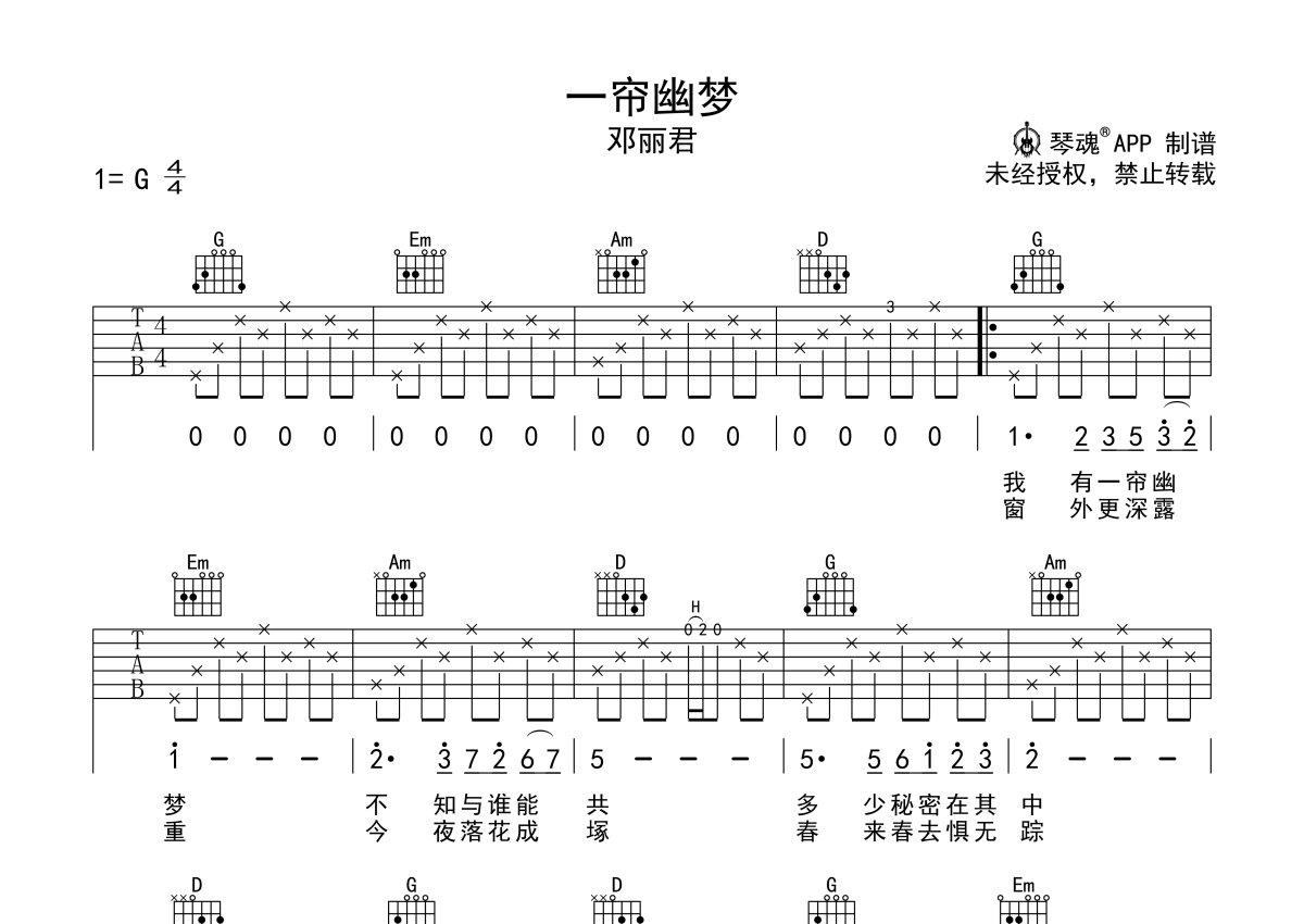 邓丽君《一帘幽梦》吉他谱 - G调弹唱六线谱