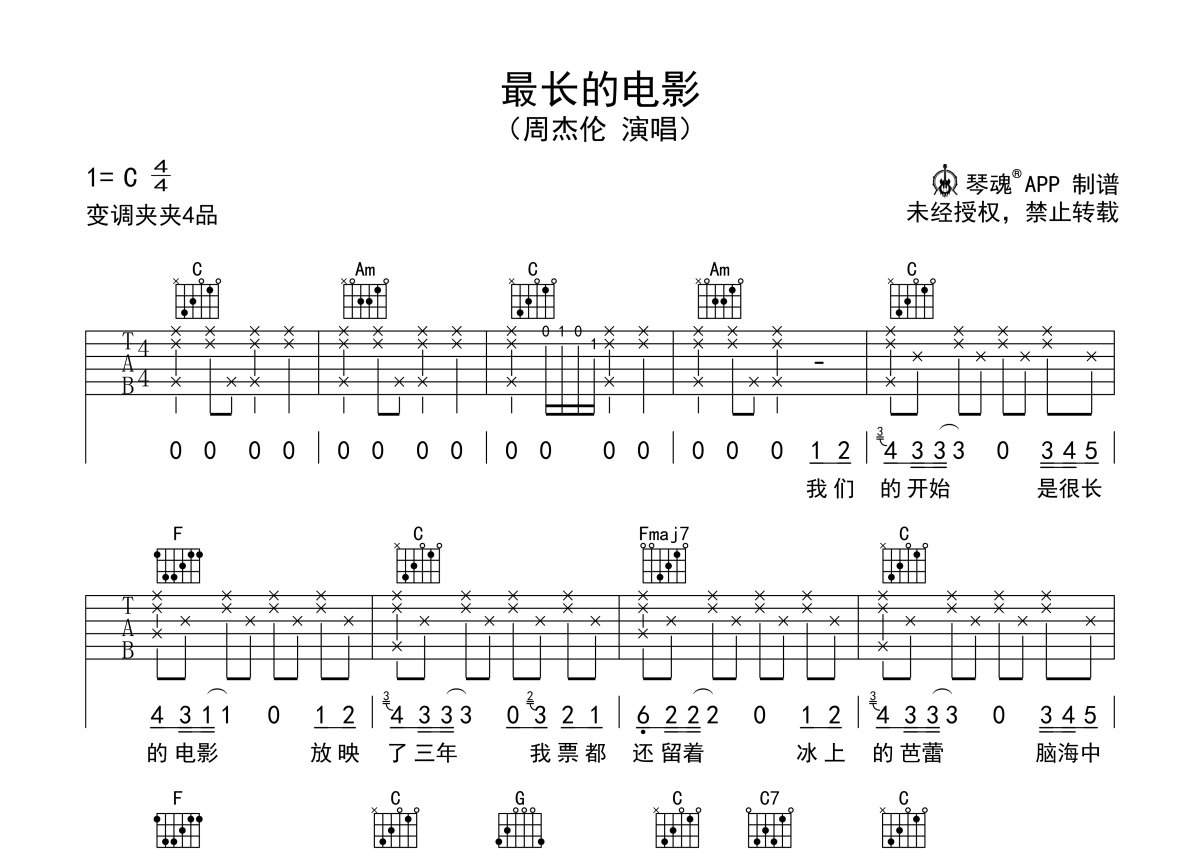 周杰伦《最长的电影》吉他谱 - C调弹唱六线谱