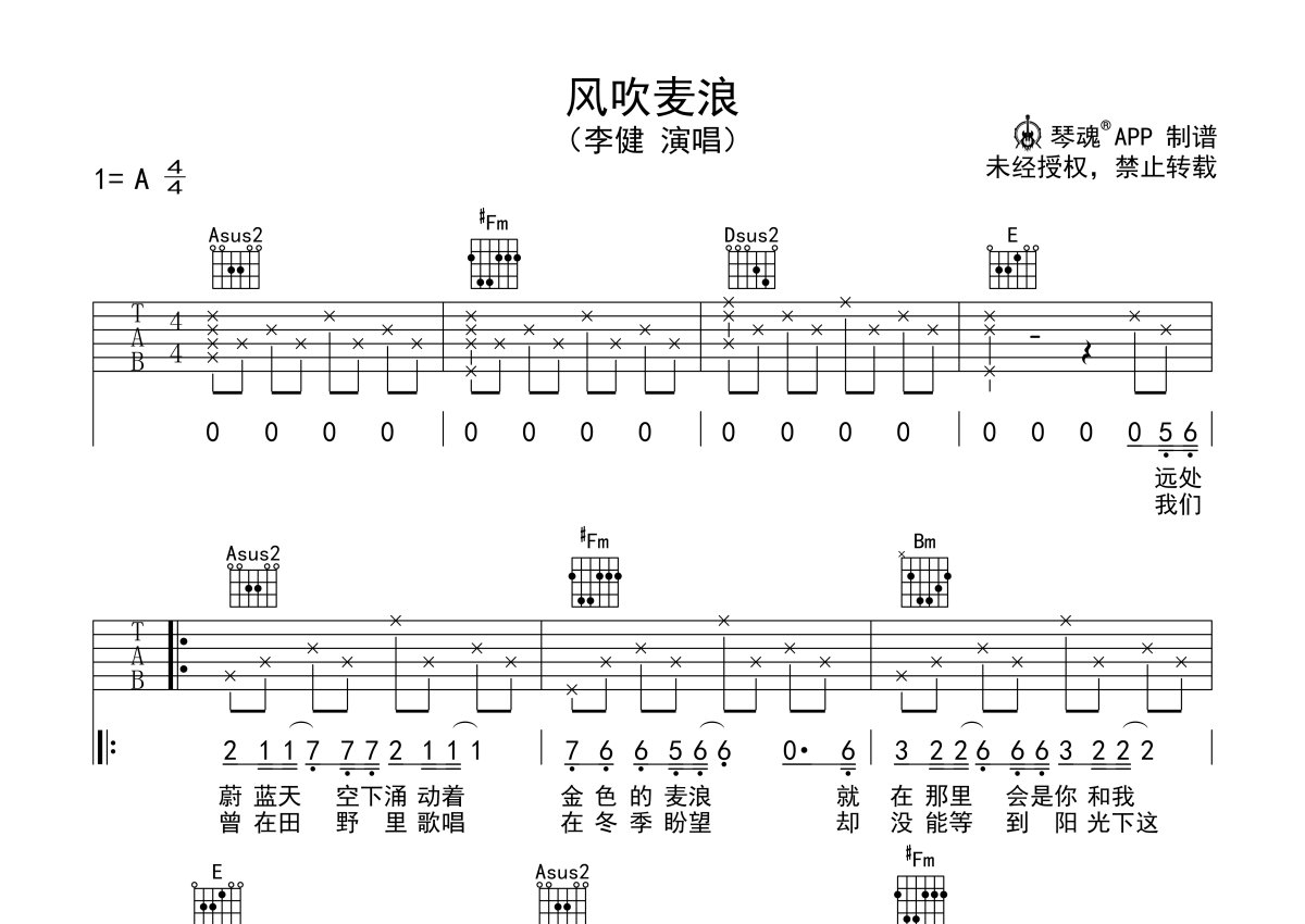李健《风吹麦浪》吉他谱 - A调弹唱六线谱 - 简单版
