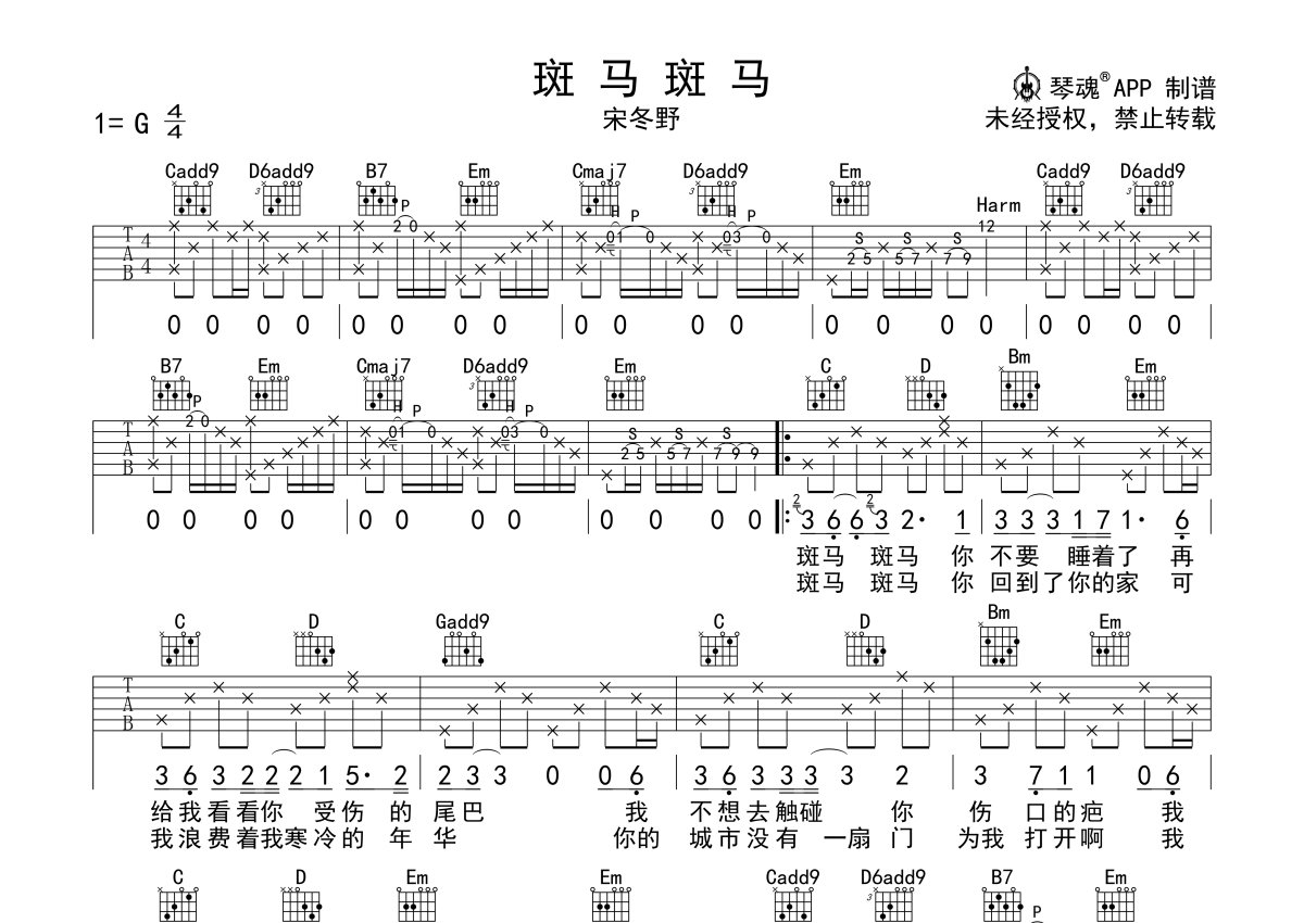 宋冬野《斑马斑马》吉他谱 - G调弹唱六线谱