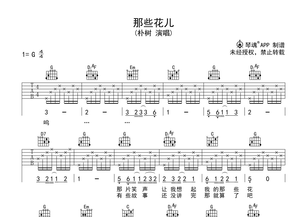 《那些花儿》是朴树演唱的一首歌曲,简单版,本吉他谱采用的是G调指法编配,这份吉他谱共有两张高清图谱,图谱由 @随心谱 编配上传,图谱使用六线谱编配,包含吉他和弦指法、简谱以及歌词部分,使用这份那些花儿吉他谱,可以让你更加方便地掌握这首歌曲的弹唱技巧,快来尝试吧。简单抒情版入门弹唱。一首校园民谣绝对不能忽视的歌曲,也是吉他弹唱经典曲目。