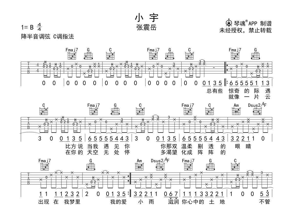 《小宇》是张震岳演唱的一首歌曲,完美弹唱谱,本吉他谱采用的是C调指法编配,这份吉他谱共有两张高清图谱,图谱由 @随心谱 编配上传,图谱使用六线谱编配,包含吉他和弦指法、简谱以及歌词部分,使用这份小宇吉他谱,可以让你更加方便地掌握这首歌曲的弹唱技巧,快来尝试吧。原调B,降半音调弦,一首充满高中时代的美好回忆的歌曲,听起来带点小美好,我不管未来会怎么样,但我每天都想见到你。这首歌是张震岳为当时的女友所写,两人在美丽的邂逅之后产生了爱情的火花,但那女生对于身份和未来有所顾忌。这种情况下阿岳写下了这首歌,不仅是对那女生的一种答复和安慰,同时也是鼓励人们要勇敢一点去爱。