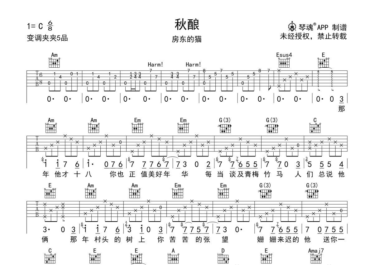 房东的猫《秋酿》吉他谱 - C调弹唱六线谱