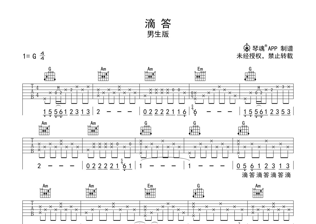 侃侃《滴答》吉他谱 - G调弹唱六线谱 - 男生版