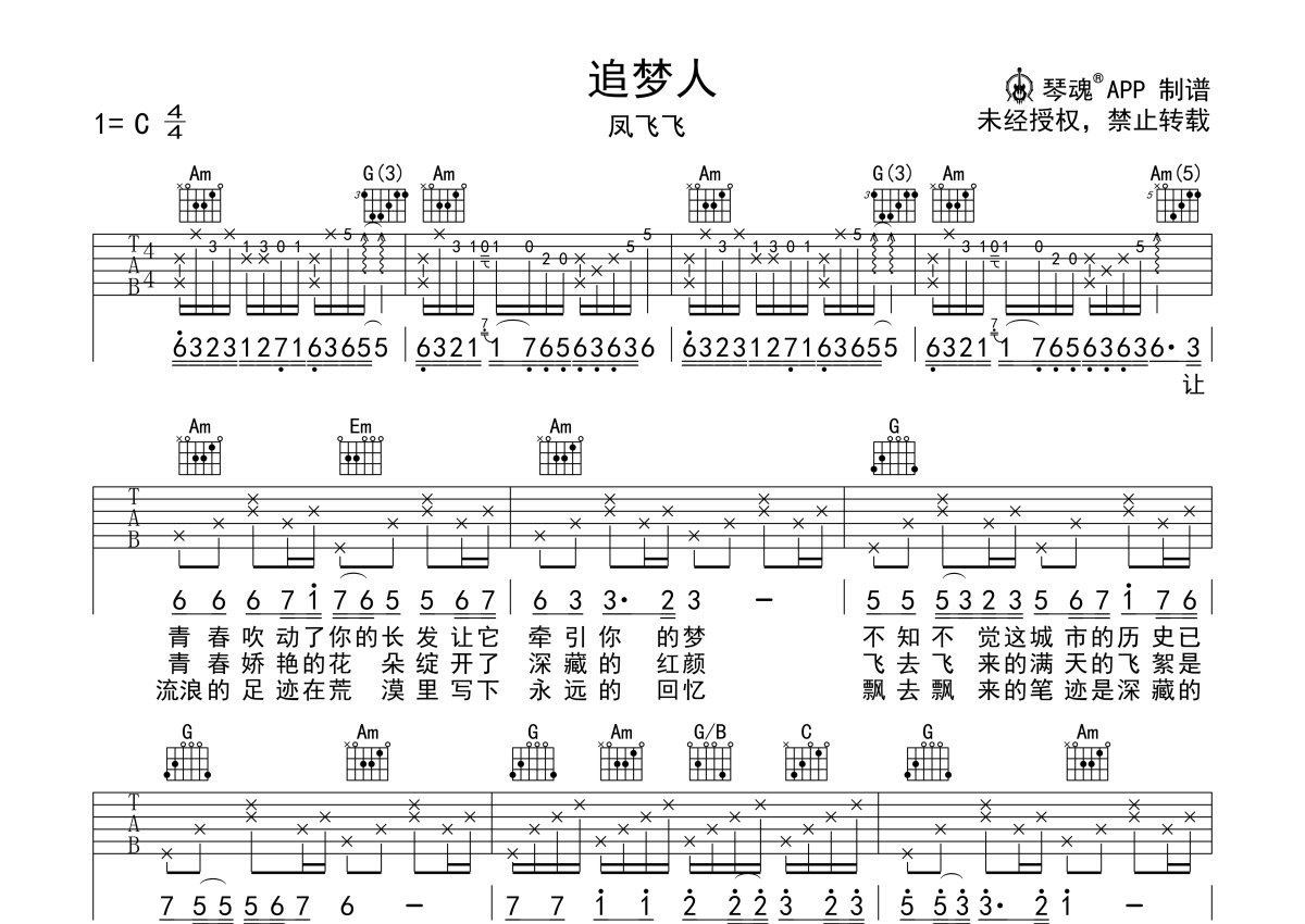 凤飞飞《追梦人》吉他谱 - C调弹唱六线谱