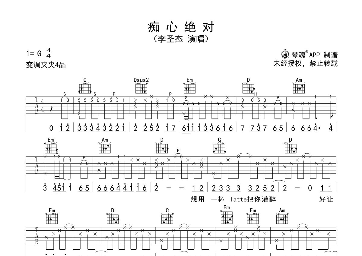 李圣杰《痴心绝对》吉他谱 - G调弹唱六线谱