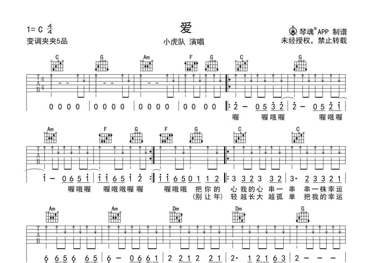《爱》是小虎队演唱的一首歌曲,本吉他谱采用的是C调指法编配,这份吉他谱共有两张高清图谱,图谱由 @随心谱 编配上传,图谱使用六线谱编配,包含吉他和弦指法、简谱以及歌词部分,使用这份爱吉他谱,可以让你更加方便地掌握这首歌曲的弹唱技巧,快来尝试吧。原调F调,变调夹5品。