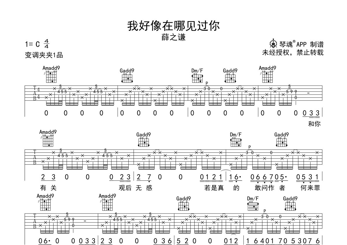 薛之谦《我好像在哪见过你》吉他谱 - C调弹唱六线谱