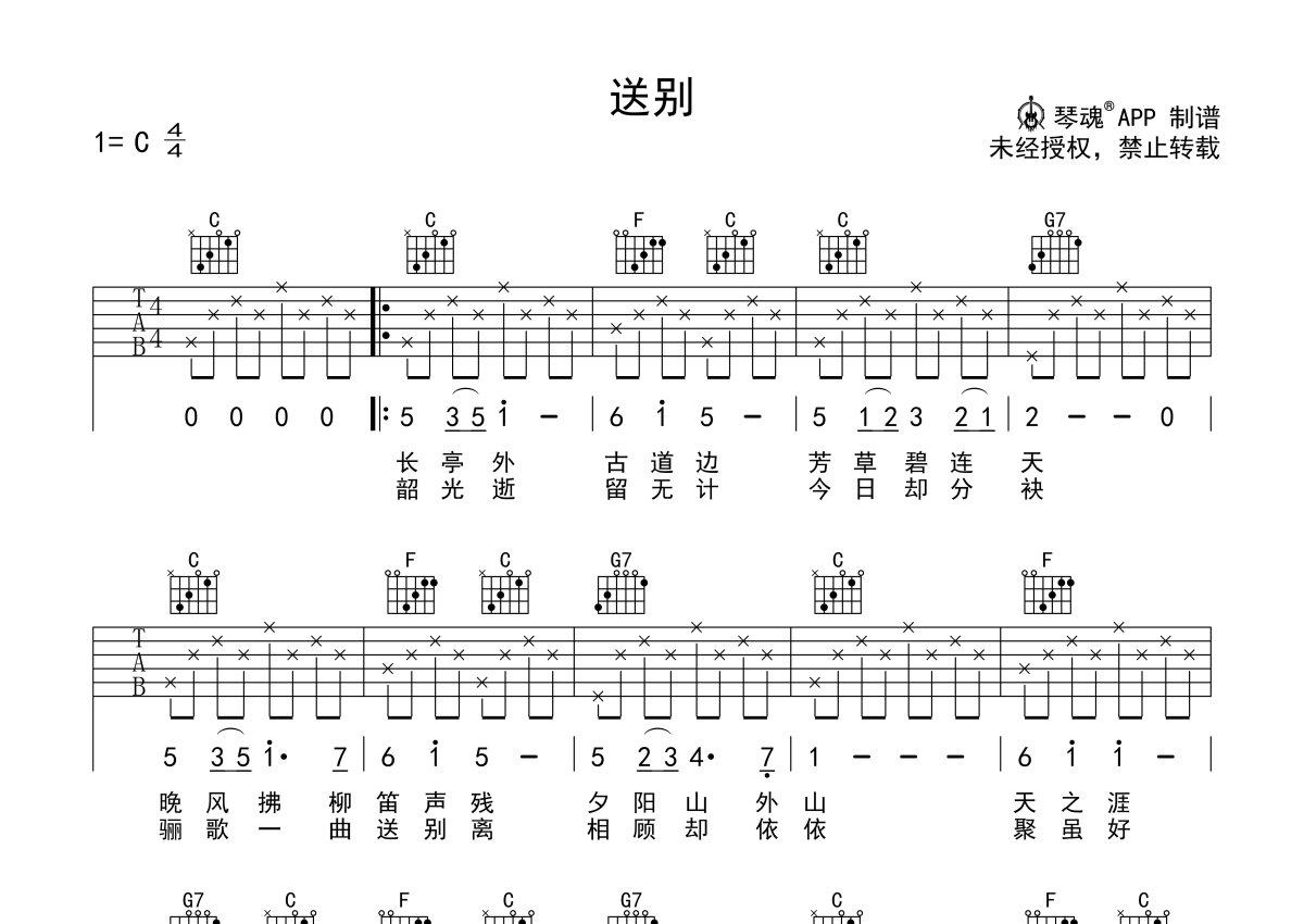 《送别》是李志演唱的一首歌曲,简易入门版,本吉他谱采用的是C调指法编配,这份吉他谱共有一张高清图谱,图谱由 @随心谱 编配上传,图谱使用六线谱编配,包含吉他和弦指法、简谱以及歌词部分,使用这份送别吉他谱,可以让你更加方便地掌握这首歌曲的弹唱技巧,快来尝试吧。李Z翻唱版本,一首充满淡淡离别愁绪的经典老歌。