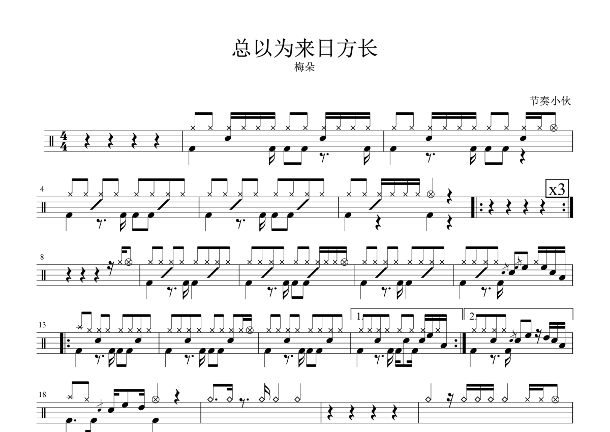 《总以为日方长》是梅朵演唱的一首歌曲,这份鼓谱共有一张高清图谱,图谱由 @小黄 编配上传,图谱使用五线谱编配,使用这份总以为日方长架子鼓谱,你将能够轻松地敲打出这首梅朵的总以为日方长,快来尝试吧。