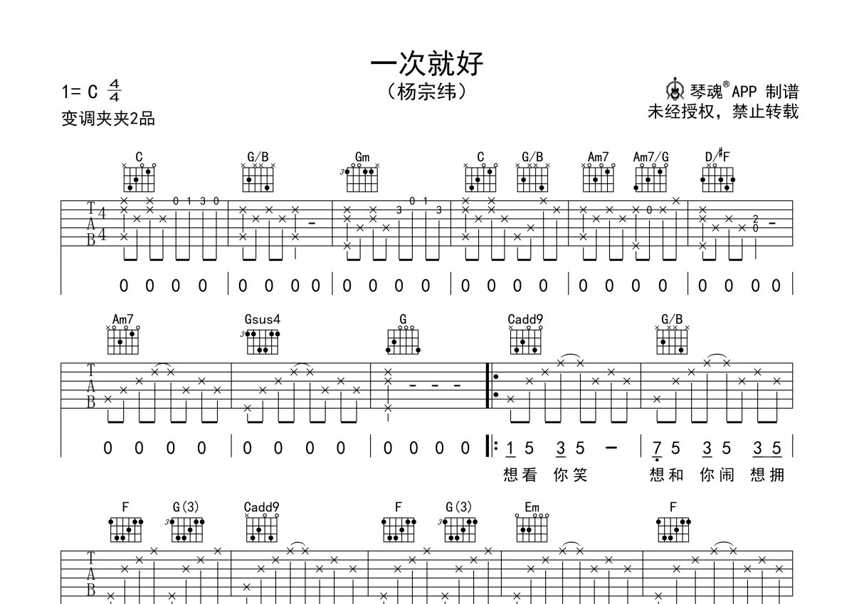 《一次就好》是杨宗纬演唱的一首歌曲,本吉他谱采用的是C调指法编配,这份吉他谱共有两张高清图谱,图谱由 @随心谱 编配上传,图谱使用六线谱编配,包含吉他和弦指法、简谱以及歌词部分,使用这份一次就好吉他谱,可以让你更加方便地掌握这首歌曲的弹唱技巧,快来尝试吧。《一次就好》是杨宗纬演唱的歌曲,由陈曦作词,董冬冬谱曲,歌曲发行于2015年10月20日,是电影《夏洛特烦恼》中夏洛给喜欢的女生秋雅创作的歌曲,却意外成了马冬梅的最爱,很温暖很治愈。 《一次就好》唱出了许多画面,暗恋,单恋的人听著会为自己的想像画面傻笑著吧,热恋的人听著很是甜蜜暖心,还可以拿来当告白歌曲,失恋的人听著会陷入各种回忆并且伤感落泪…… 最朴实的歌词唱出最温暖的情话,也唱出多少人渴望的简单的幸福。
