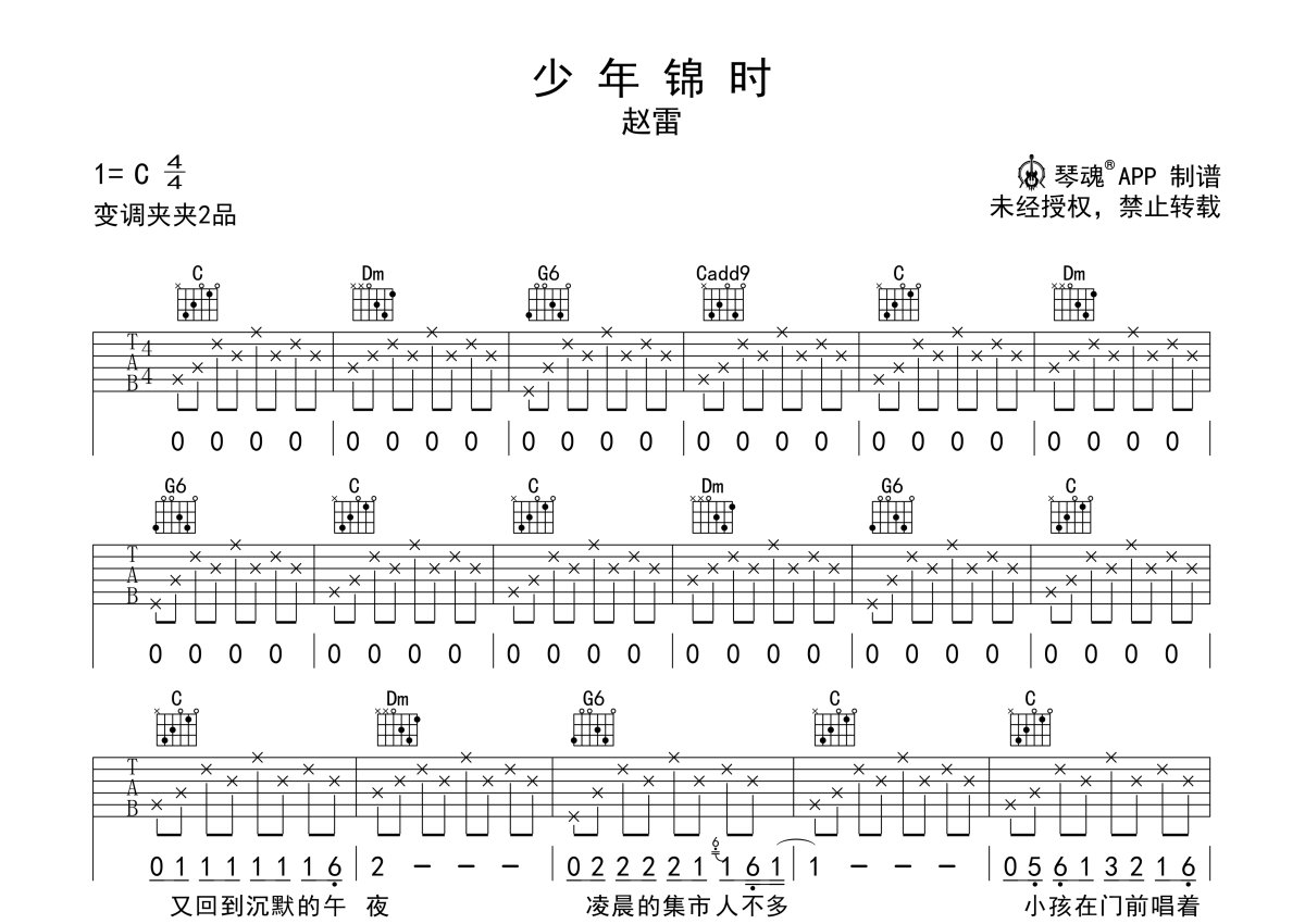 赵雷《少年锦时》吉他谱 - C调弹唱六线谱