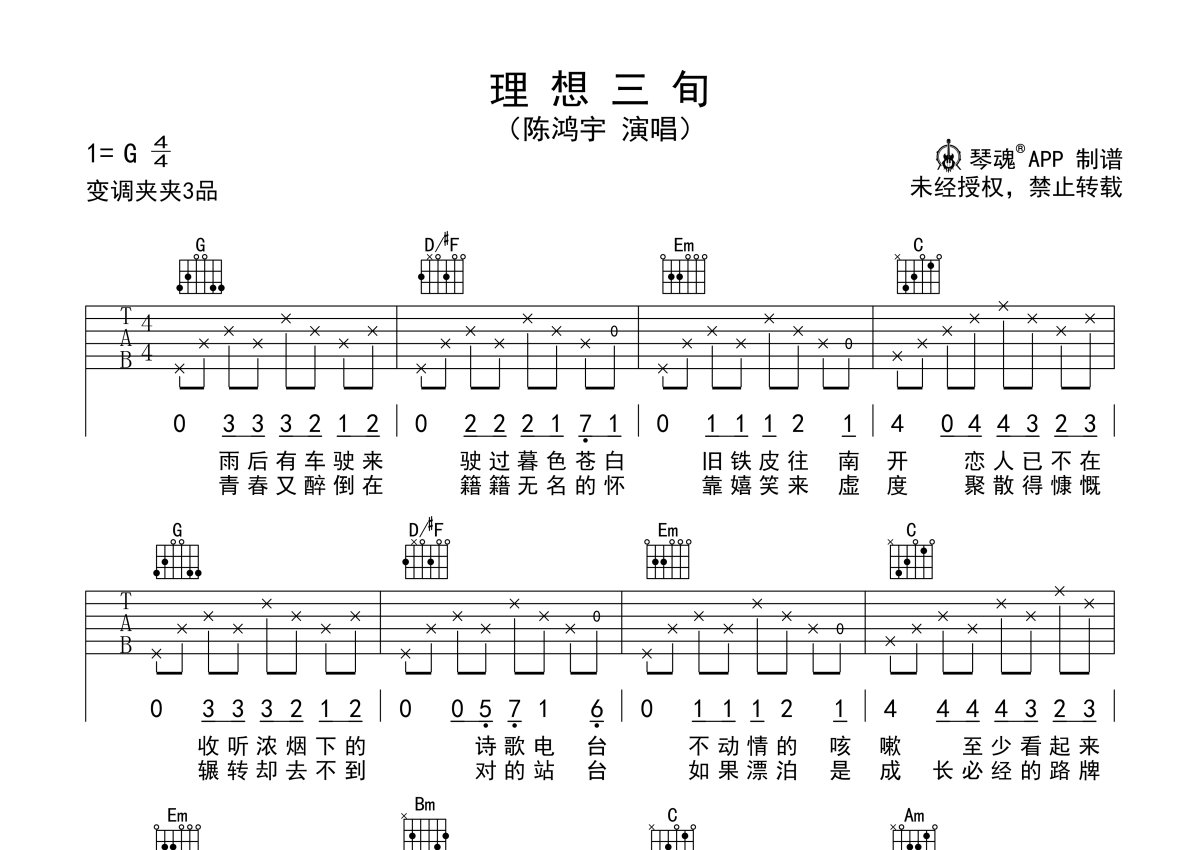 《理想三旬》是陈鸿宇演唱的一首歌曲,本吉他谱采用的是G调指法编配,这份吉他谱共有两张高清图谱,图谱由 @随心谱 编配上传,图谱使用六线谱编配,包含吉他和弦指法、简谱以及歌词部分,使用这份理想三旬吉他谱,可以让你更加方便地掌握这首歌曲的弹唱技巧,快来尝试吧。结果,做音乐,竟然变成了陈鸿宇退无可退的选择,但也是终身的选择。“也是突然想通了,我何必要通过社会所认可的或者是行业发展趋势去判断我该做什么呢?难道不应该从自己的角度去琢磨我适合和擅长什么吗?哪怕行业没那么规范,挣得不那么多,发展潜力不大,但是我喜欢,我愿意跟它长时间呆在一起。”他继续在城市里折腾着,创办音乐厂牌“众乐纪”,每年做民谣合辑,办跨年音乐会,搭车巡演……好在《理想三旬》终于让人们记住了这个同样带着点理想来自内蒙古大草原的年轻人。音乐如同陈鸿宇的日记,最初他的歌更多的是关于个人的成长和理想的关系,在城市里有点失落的感觉,简单来说,那时他还困顿在城市之中,还在为生存考虑着。如今,他已小有名气,成了民谣界的颜值担当,被誉为“下一个朴树”,有了无数疯狂的迷妹,而且三月到五月就要把演出从livehouse开进全国各大剧场里。渐渐的陈鸿宇好像已经变成了一个“现代人”,城市的不确定性和可能性是他留下的原因。但是他终究是从荒野里来的,那座正方体的小空间则成了他在现代生活中的一个调剂,现在他可能不会像一个隐士那样在那个房子里隐居,但未来有可能。