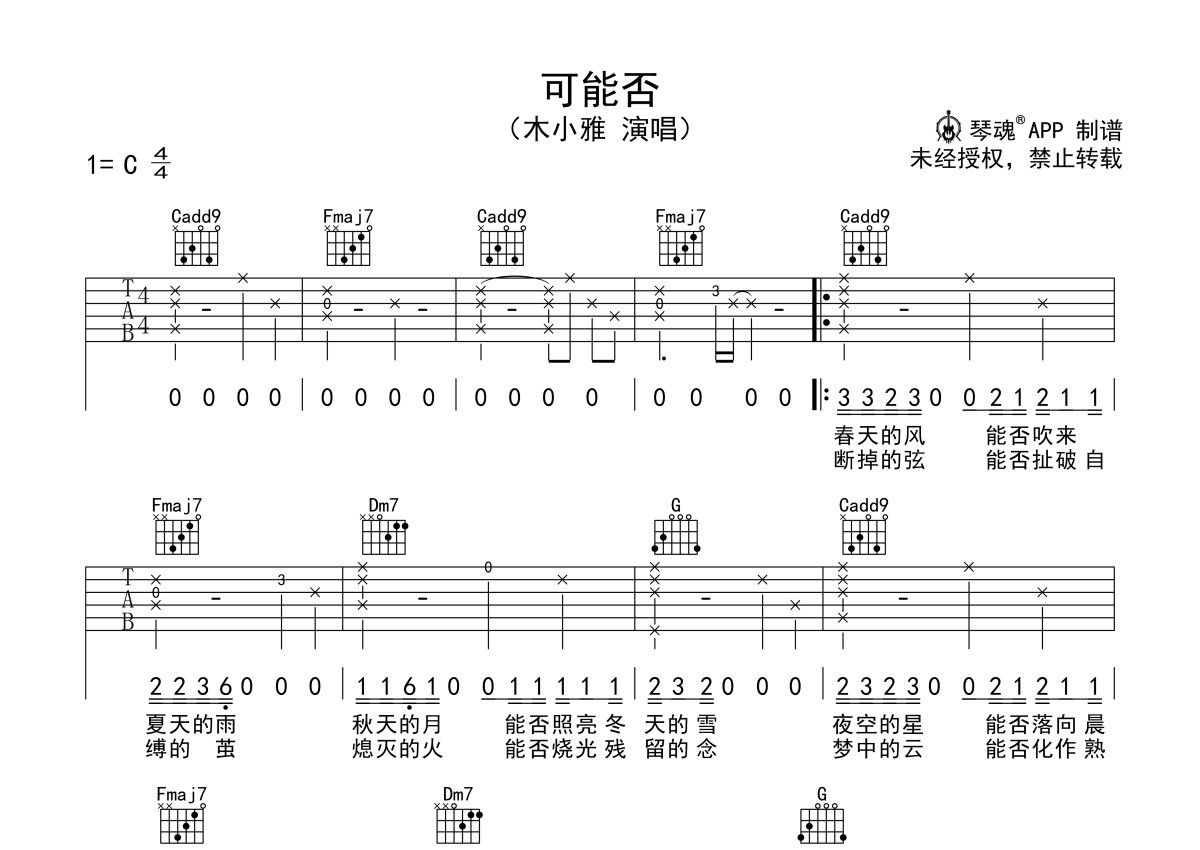 《可能否》是木小雅演唱的一首歌曲,本吉他谱采用的是C调指法编配,这份吉他谱共有两张高清图谱,图谱由 @随心谱 编配上传,图谱使用六线谱编配,包含吉他和弦指法、简谱以及歌词部分,使用这份可能否吉他谱,可以让你更加方便地掌握这首歌曲的弹唱技巧,快来尝试吧。 《可能否》是木小雅演唱的歌曲,同时这个也是作为网易云音乐“石头计划”第二季的第二首原创作品,其明快清澈的旋律加之深入人心的歌词,获得一致好评;据木小雅介绍,〈可能否〉这首歌曲,灵感来自于诗人张枣在《镜中》的那句:“每当想起一生中后悔的事,梅花便落满了南山。” 木小雅想通过〈可能否〉这首歌,表达自己对人生相遇与错过的态度。同张枣一样,木小雅在歌词中描述着那些错过的迷惘:“能否早一点,相信年少的誓言,能否不轻易说再见。”同时,她也写出自己的倔强与执拗:“可能我撞了南墙才会回头吧,可能我偏要一条路走到黑吧”……这些歌词,也是木小雅创作之路的写照。作者木小雅也在评论里说“愿多年以后,你撞过的南墙,都成为坦途;你遇见过的绝望,都成为最美的盛放”。94年出生的水瓶座girl。幼时学习过二胡,后又自学了吉他和尤克里里。大学二年级时在校创立Ukulele社团,从那时起开始尝试写歌。 所学为设计专业,毕业后成为了一名设计师,在一家书店工作。业余时间依然弹琴写歌,一直以文字、音乐和设计作品,践行自己的理想主义。写于2016年秋天的《大地上的异乡者》,成功入围2017第十二届华研·阿里词曲唱作人大赛全国40强。2017年夏天,所创作的《守》被选为《了不起的匠人》第二季的网络宣传曲。2017年12月,携原创作品《坠星》参加虾米音乐主办的造音之星大赛,入围全国十强并获得第6名。2018年3月,所写歌曲《城南谣》和《可能否》入选网易云石头计划第二季。 。