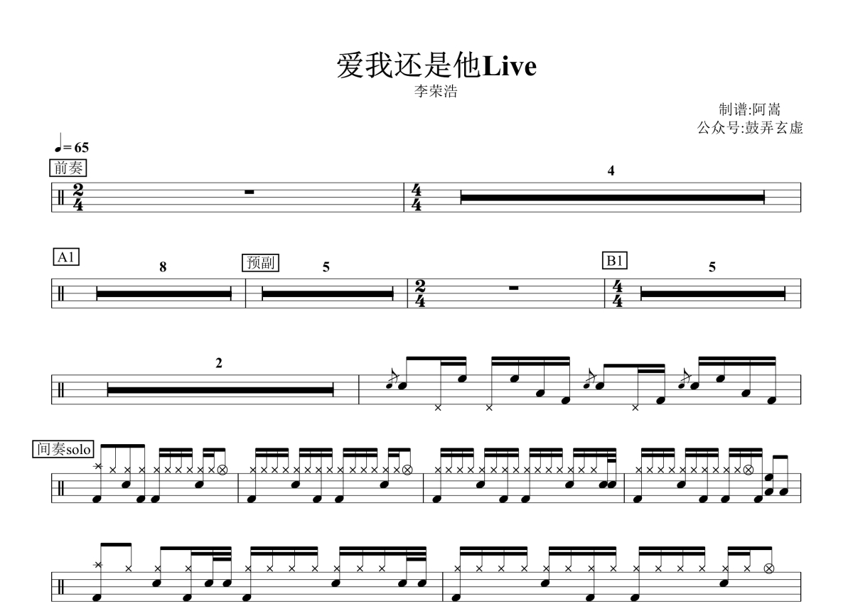 李荣浩《爱我还是他》鼓谱 - 架子鼓谱 - 中国好声音Live版
