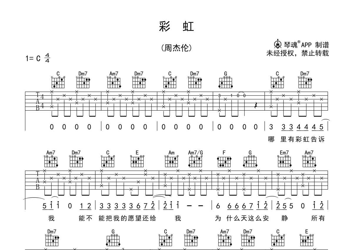 周杰伦《彩虹》吉他谱 - C调弹唱六线谱