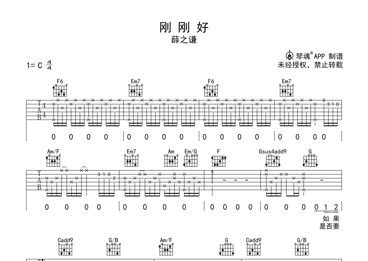 薛之谦《刚刚好》吉他谱 - C调弹唱六线谱