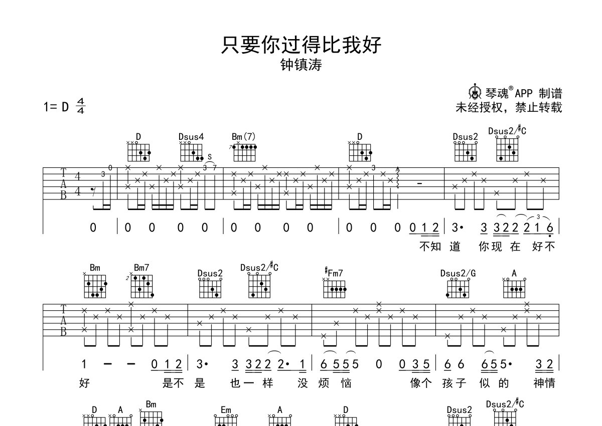 《只要你过得比我好》是钟镇涛演唱的一首歌曲,本吉他谱采用的是D调指法编配,这份吉他谱共有两张高清图谱,图谱由 @随心谱 编配上传,图谱使用六线谱编配,包含吉他和弦指法、简谱以及歌词部分,使用这份只要你过得比我好吉他谱,可以让你更加方便地掌握这首歌曲的弹唱技巧,快来尝试吧。钟镇涛《只要你过得比我好》吉他谱_D调吉他弹唱谱。