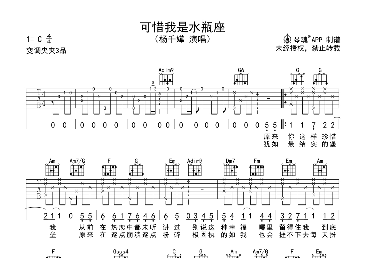 杨千嬅《可惜我是水瓶座》吉他谱 - C调弹唱六线谱