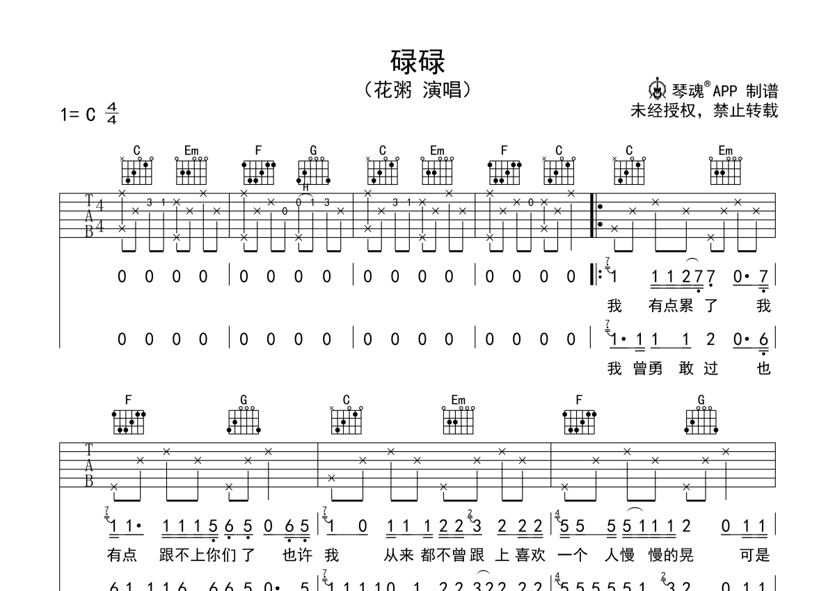 花粥《碌碌》吉他谱 - C调弹唱六线谱