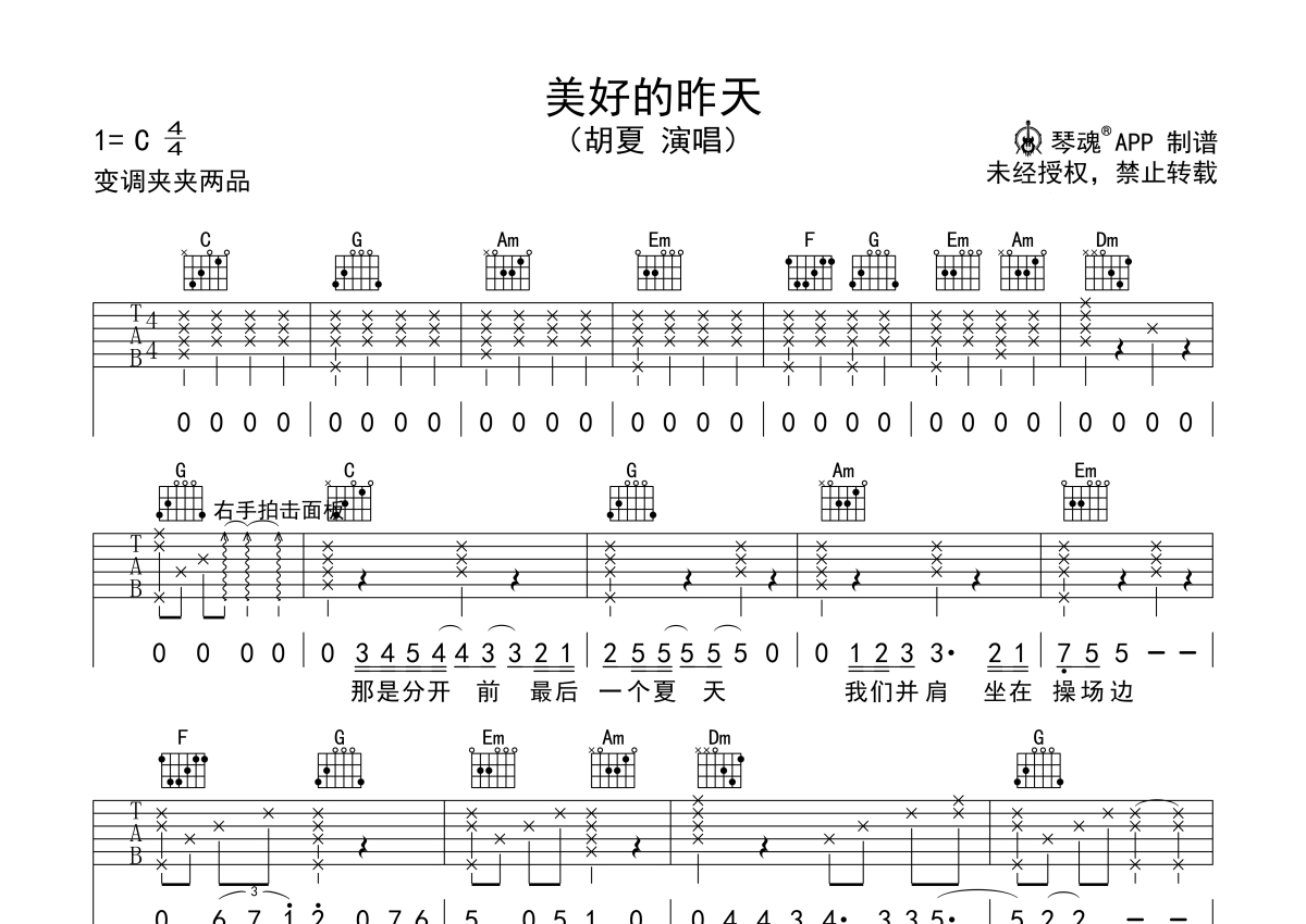 胡夏《美好的昨天》吉他谱 - C调弹唱六线谱