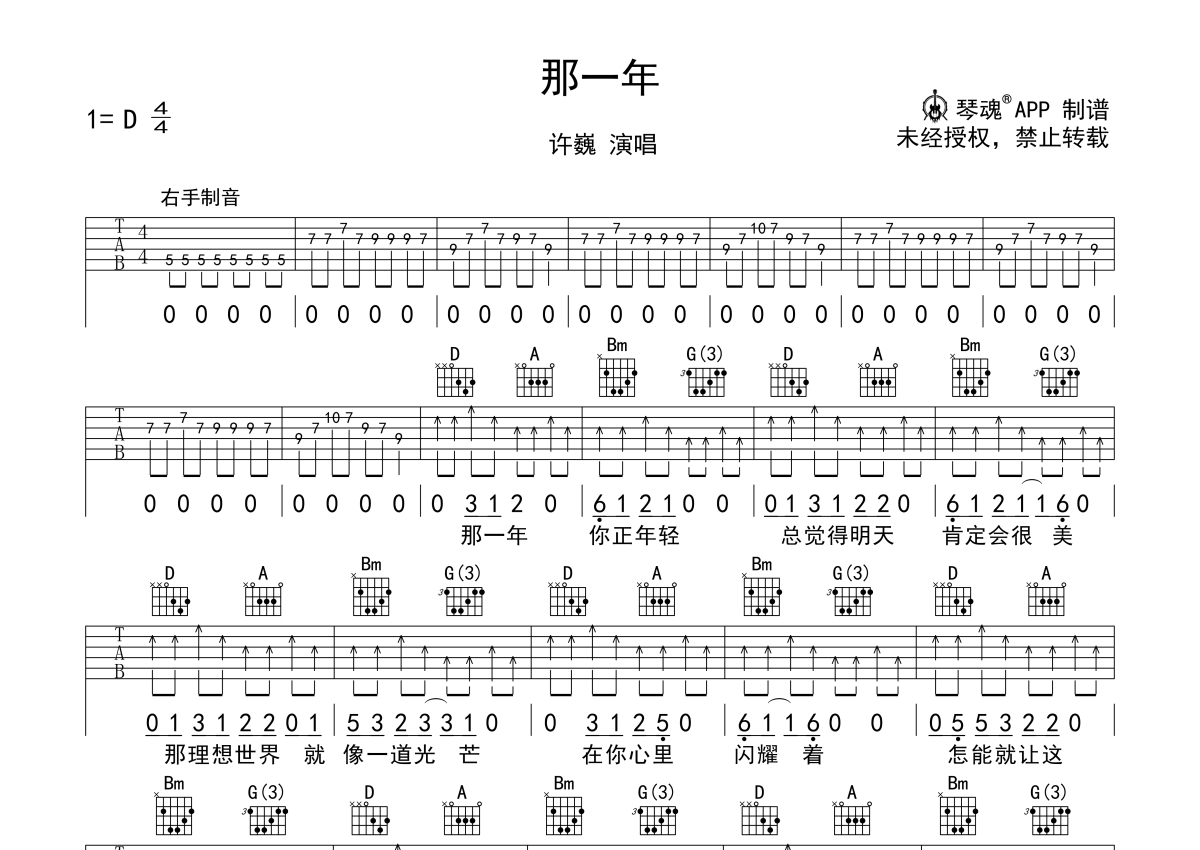 许巍《那一年》吉他谱 - D调弹唱六线谱