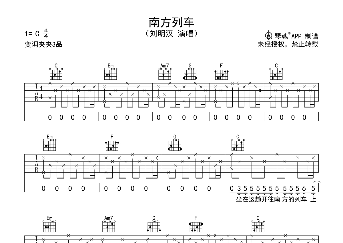 刘明汉《南方列车》吉他谱 - C调弹唱六线谱