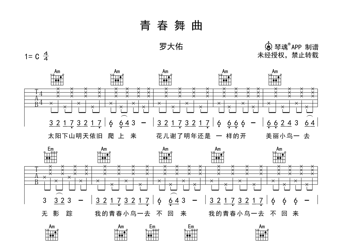 罗大佑《青春舞曲》吉他谱 - C调弹唱六线谱