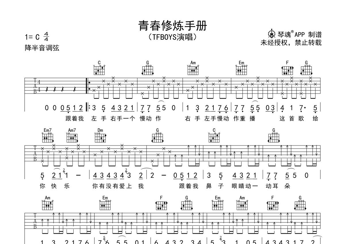 TFBOYS《青春修炼手册》吉他谱 - C调弹唱六线谱