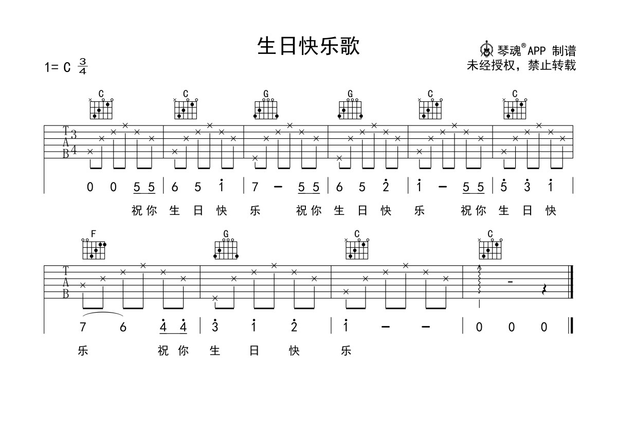 《生日快乐歌》,超级简单版,本吉他谱采用的是C调指法编配,这份吉他谱共有一张高清图谱,图谱由 @随心谱 编配上传,图谱使用六线谱编配,包含吉他和弦指法、简谱以及歌词部分,使用这份生日快乐歌吉他谱,可以让你更加方便地掌握这首歌曲的弹唱技巧,快来尝试吧。《生日快乐歌》吉他谱_C调吉他弹唱谱_超级简单版。
