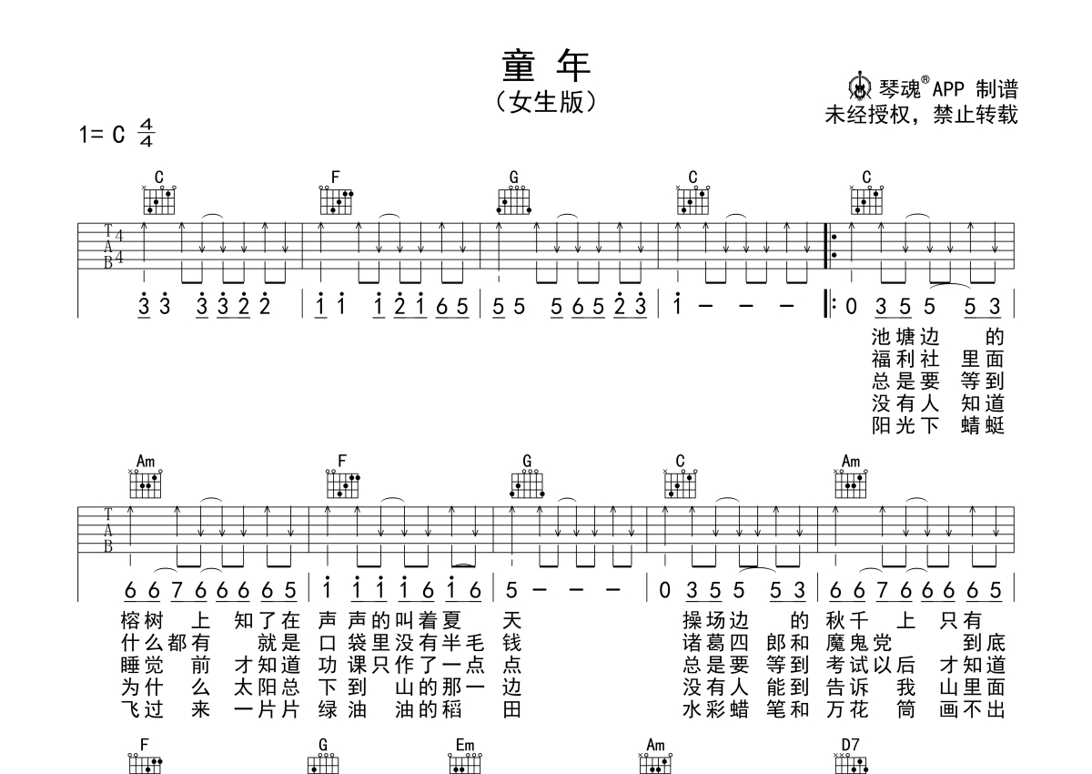 罗大佑《童年》吉他谱 - C调弹唱六线谱
