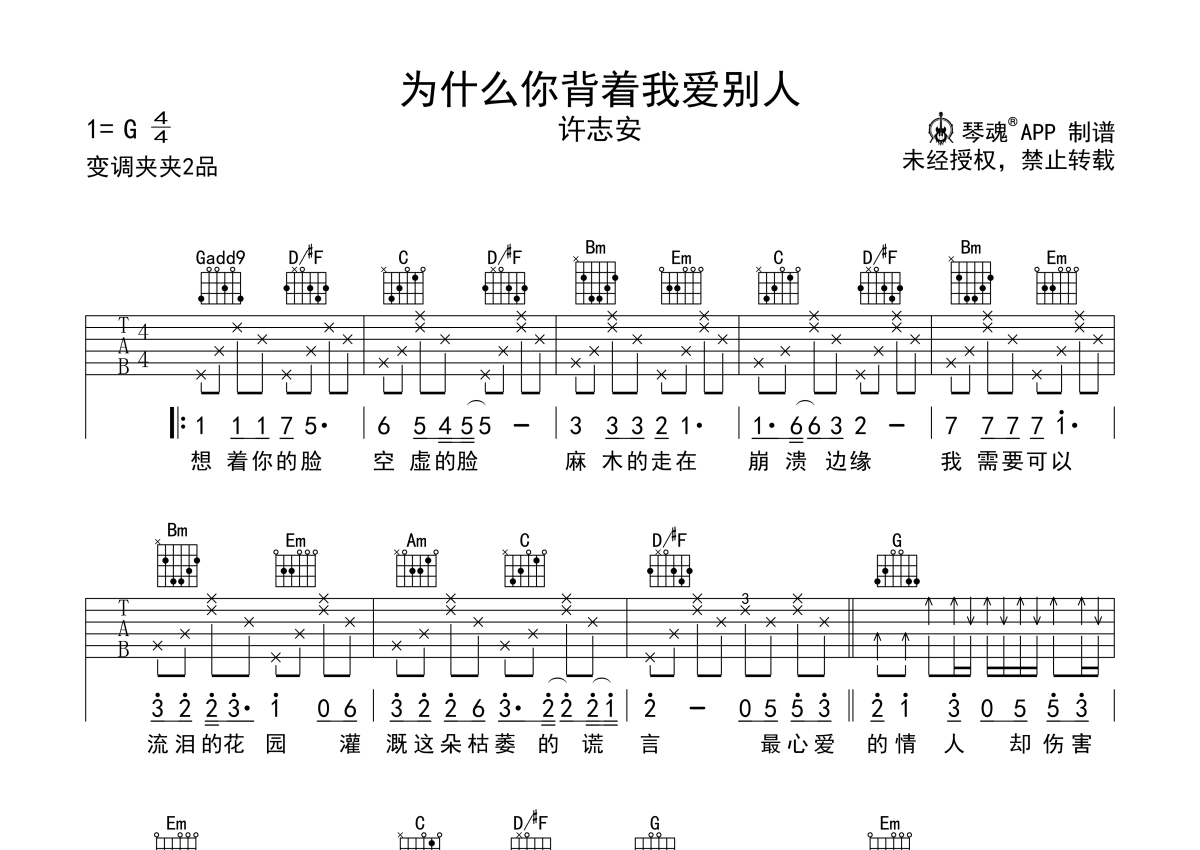 《为什么你背着我爱别人》是许志安演唱的一首歌曲,本吉他谱采用的是G调指法编配,这份吉他谱共有两张高清图谱,图谱由 @随心谱 编配上传,图谱使用六线谱编配,包含吉他和弦指法、简谱以及歌词部分,使用这份为什么你背着我爱别人吉他谱,可以让你更加方便地掌握这首歌曲的弹唱技巧,快来尝试吧。许志安《为什么你背着我爱别人》吉他谱_G调吉他弹唱谱。