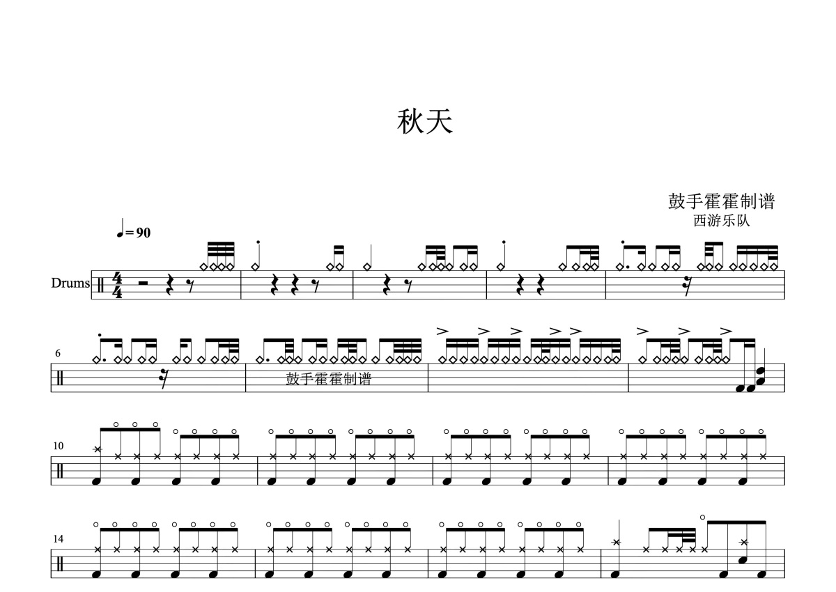 《秋天》是西游乐队演唱的一首歌曲,这份鼓谱共有四张高清图谱,图谱由 @打鼓谱 编配上传,图谱使用五线谱编配,使用这份秋天架子鼓谱,你将能够轻松地敲打出这首西游乐队的秋天,快来尝试吧。西游乐队是由周飞担任主唱、张琪琳担任吉他手、张晓担任二胡手、商子龙担任贝斯手、余伟民担任鼓手而组成的乐队,于2009年正式在北京成立。