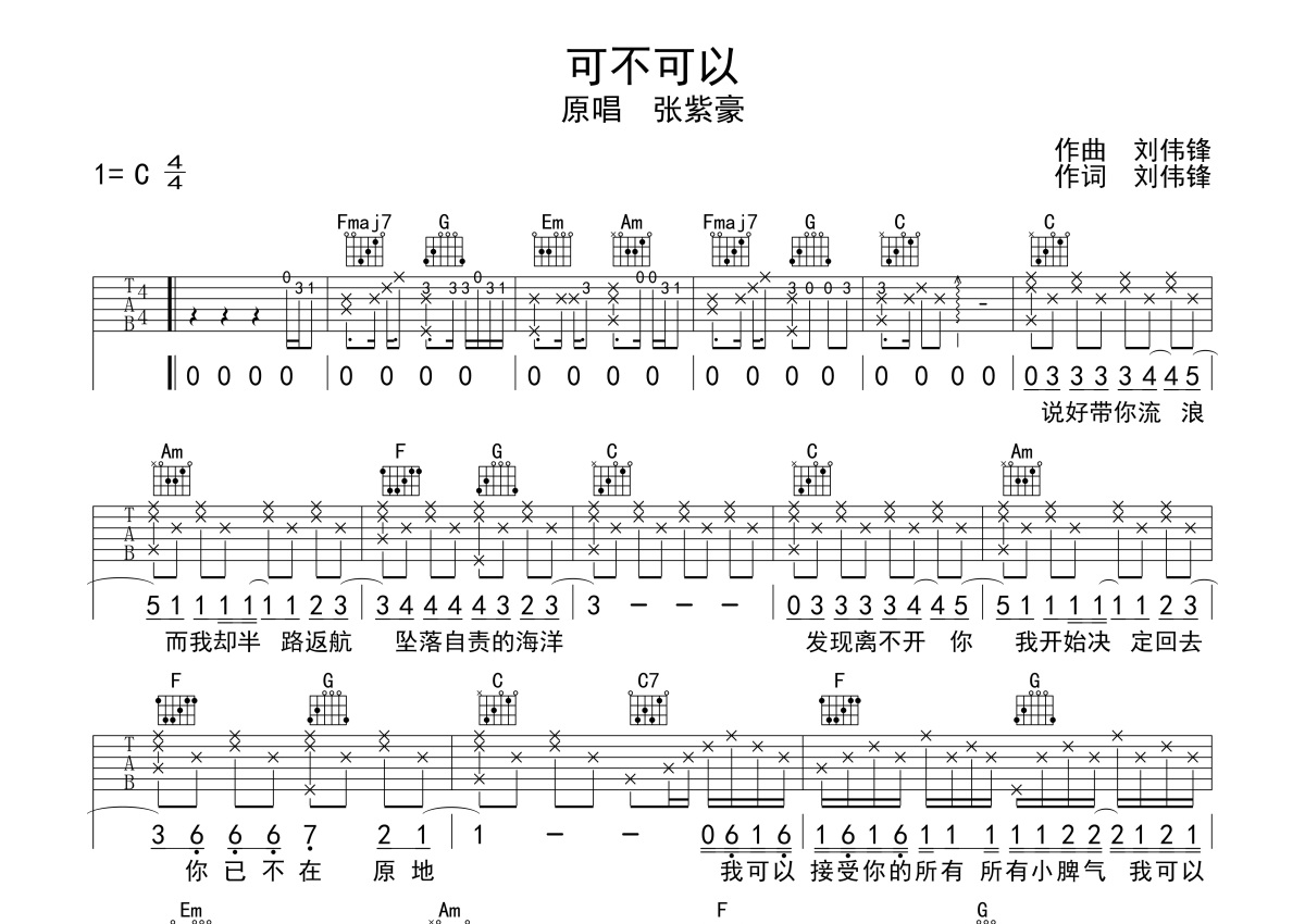 《可不可以》是张紫豪演唱的一首歌曲,本吉他谱采用的是C调指法编配,这份吉他谱共有两张高清图谱,图谱由 @梦马音乐官方 编配上传,图谱使用六线谱编配,包含吉他和弦指法、简谱以及歌词部分,曲谱配备了相关的视频提供浏览,使用这份可不可以吉他谱,可以让你更加方便地掌握这首歌曲的弹唱技巧,快来尝试吧。一首好听的网络热门歌曲,夏祯阳老师要点讲解:这首歌弹和唱的部分都很简单。我基本也都是按照原版的感觉来做的。中间间奏由一段solo,我没有标在谱上,也没有拍视频。大家可以跳过,感兴趣的可以自己扒一下,很简单。