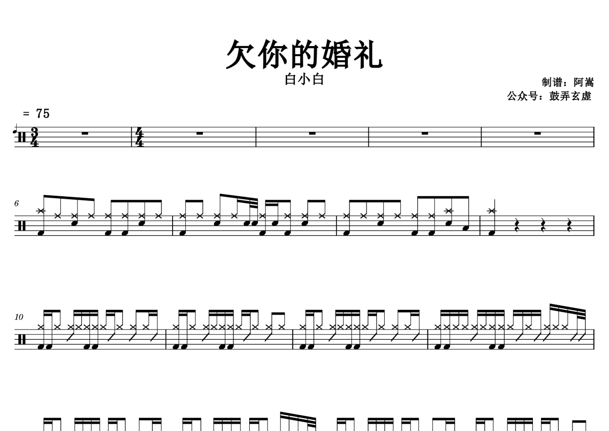 《欠你的婚礼》是白小白演唱的一首歌曲,这份鼓谱共有三张高清图谱,图谱由 @小黄 编配上传,图谱使用五线谱编配,使用这份欠你的婚礼架子鼓谱,你将能够轻松地敲打出这首白小白的欠你的婚礼,快来尝试吧。