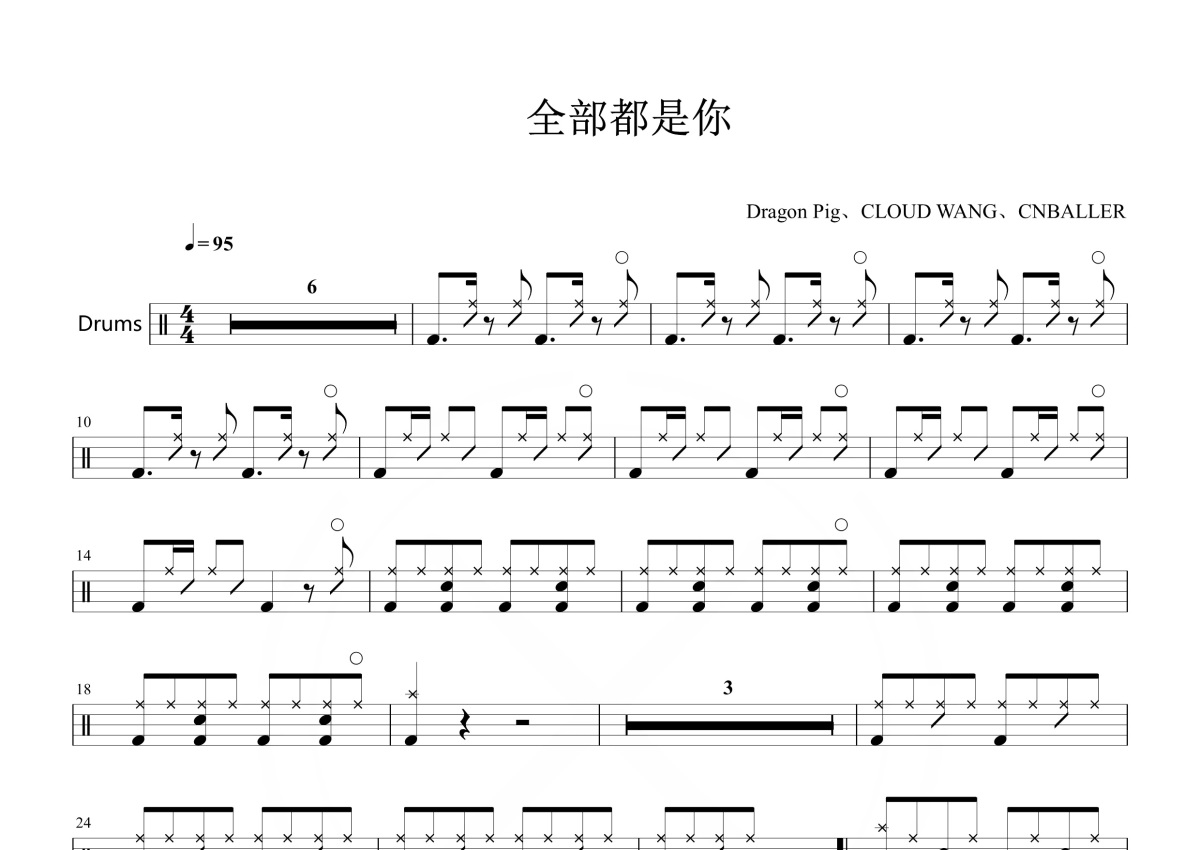 《全部都是你》是DP龙猪(Dragon Pig)、CNBALLER 、Cloud Wang演唱的一首歌曲,这份鼓谱共有两张高清图谱,图谱由 @打鼓谱 编配上传,图谱使用五线谱编配,使用这份全部都是你架子鼓谱,你将能够轻松地敲打出这首DP龙猪(Dragon Pig)、CNBALLER 、Cloud Wang的全部都是你,快来尝试吧。《全部都是你》是由DP龙猪作词作曲,DP龙猪(Dragon Pig)、CNBALLER 、Cloud Wang演唱的一首歌曲,发行于2017年03月16日。