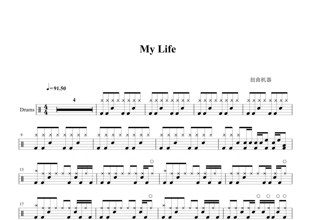 《My Life》是扭曲机器演唱的一首歌曲,这份鼓谱共有两张高清图谱,图谱由 @打鼓谱 编配上传,图谱使用五线谱编配,使用这份My Life架子鼓谱,你将能够轻松地敲打出这首扭曲机器的My Life,快来尝试吧。歌手:扭曲机器 扭曲机器 - My Life 词:梁良 曲:扭曲机器 It's my dog life money money and blood struggle It's my dog life money money and blood struggle 儿时的经历一直让我记忆犹新 ...。