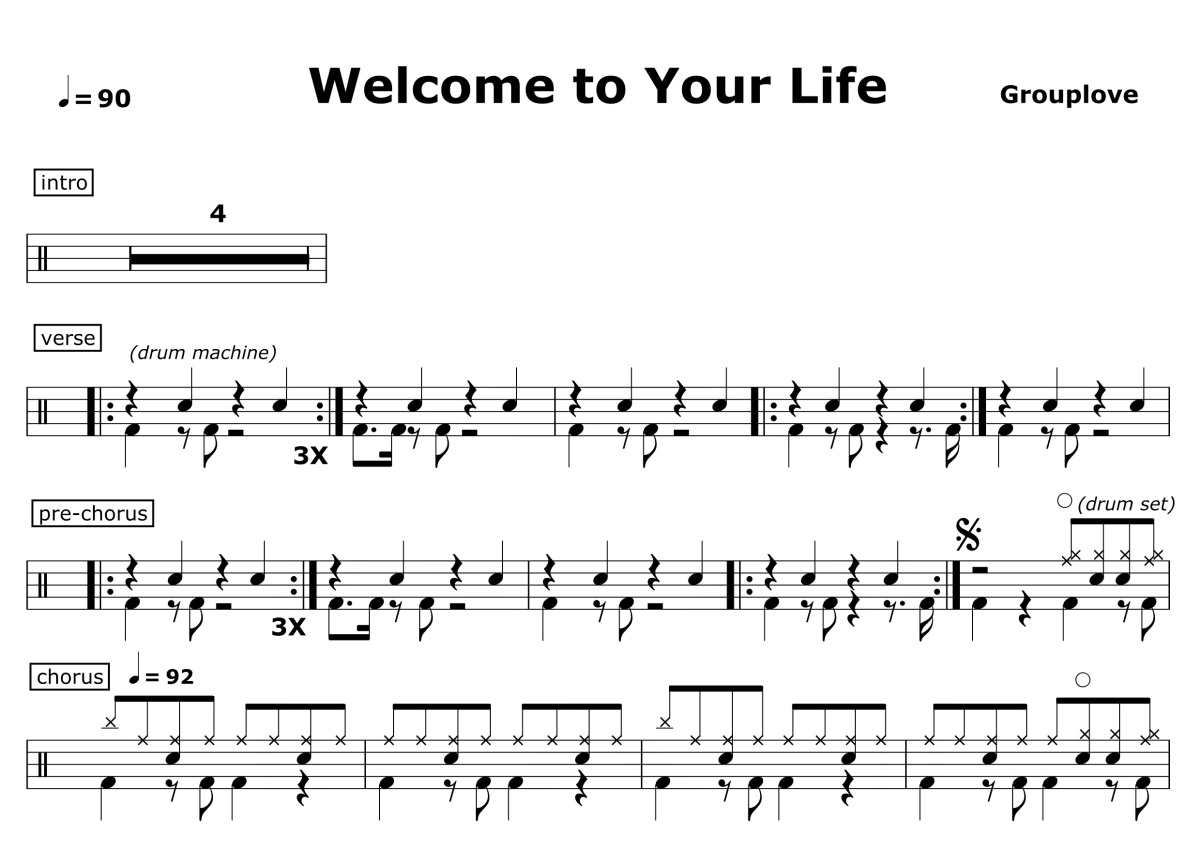 《Welcome To Your Life》是Grouplove演唱的一首歌曲,这份鼓谱共有两张高清图谱,图谱由 @打鼓谱 编配上传,图谱使用五线谱编配,使用这份Welcome To Your Life架子鼓谱,你将能够轻松地敲打出这首Grouplove的Welcome To Your Life,快来尝试吧。Welcome To Your Life 专辑:Big Mess 歌手:Grouplove Welcome To Your Life - Grouplove We're back in business You're such a big mess And I love you Yeah I love you We...。