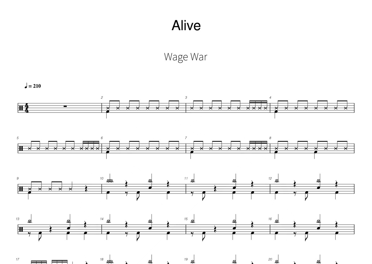 《Alive》是Wage War演唱的一首歌曲,这份鼓谱共有五张高清图谱,图谱由 @打鼓谱 编配上传,图谱使用五线谱编配,使用这份Alive架子鼓谱,你将能够轻松地敲打出这首Wage War的Alive,快来尝试吧。 Alive - Wage War // Get up 躁起来吧 This is revolution a generation rising to become the solution 这是一场革命 一代青年成长找到出路 Torn down by every word silenced no vo...。