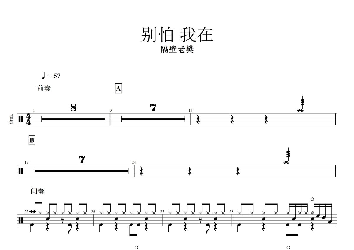 《别怕,我在》是隔壁老樊演唱的一首歌曲,这份鼓谱共有两张高清图谱,图谱由 @打鼓谱 编配上传,图谱使用五线谱编配,使用这份别怕,我在架子鼓谱,你将能够轻松地敲打出这首隔壁老樊的别怕,我在,快来尝试吧。《别怕 我在》是由隔壁老樊作词、作曲并演唱的一首歌曲,发行于2019年12月19日。