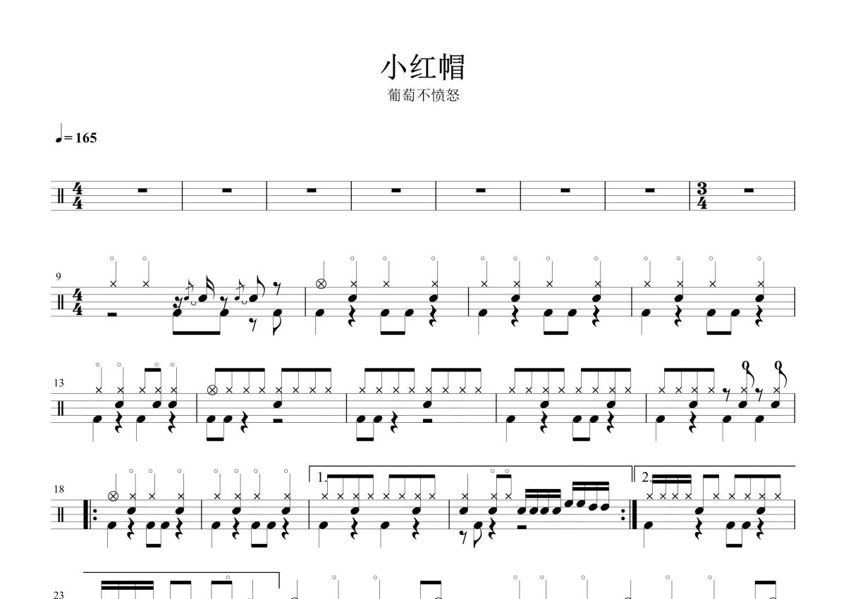 《小红帽》是葡萄不愤怒乐队演唱的一首歌曲,这份鼓谱共有三张高清图谱,图谱由 @打鼓谱 编配上传,图谱使用五线谱编配,使用这份小红帽架子鼓谱,你将能够轻松地敲打出这首葡萄不愤怒乐队的小红帽,快来尝试吧。《小红帽》架子鼓谱小红帽鼓谱是由葡萄不愤怒乐队创作并演唱的一首歌曲,朋克风格,4/4拍节奏,每分钟165拍。