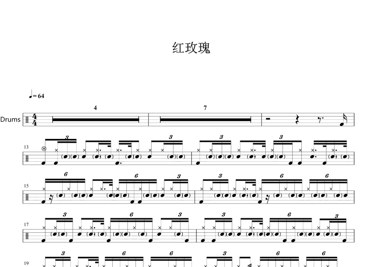 《红玫瑰》是陈奕迅演唱的一首歌曲,这份鼓谱共有两张高清图谱,图谱由 @打鼓谱 编配上传,图谱使用五线谱编配,使用这份红玫瑰架子鼓谱,你将能够轻松地敲打出这首陈奕迅的红玫瑰,快来尝试吧。《红玫瑰》是香港流行男歌手陈奕迅的一首国语歌曲,由李焯雄填词,梁翘柏编曲,收录于陈奕迅2007年发行的专辑《认了吧》中,《红玫瑰》的粤语版是《白玫瑰》,收录于2006年11月23日发行的专辑What'S Going On中。