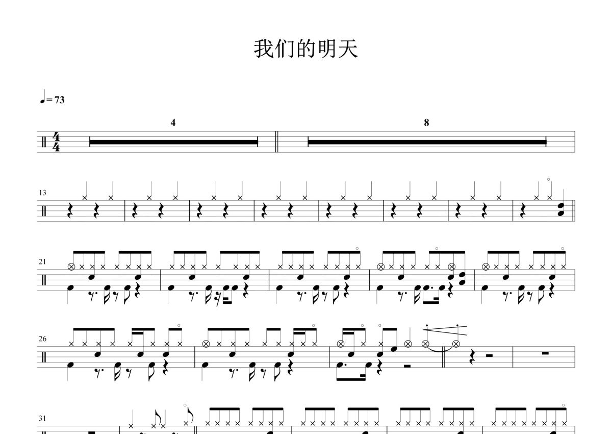 《我们的明天》是鹿晗演唱的一首歌曲,这份鼓谱共有两张高清图谱,图谱由 @打鼓谱 编配上传,图谱使用五线谱编配,使用这份我们的明天架子鼓谱,你将能够轻松地敲打出这首鹿晗的我们的明天,快来尝试吧。我们的明天架子鼓谱爵士鼓谱附鼓谱伴奏,是由鹿晗演唱的一首歌曲,由于京乐团作词作曲,制作人陈俊廷制,是电影《重返20岁》的主题曲,每分钟73拍。
