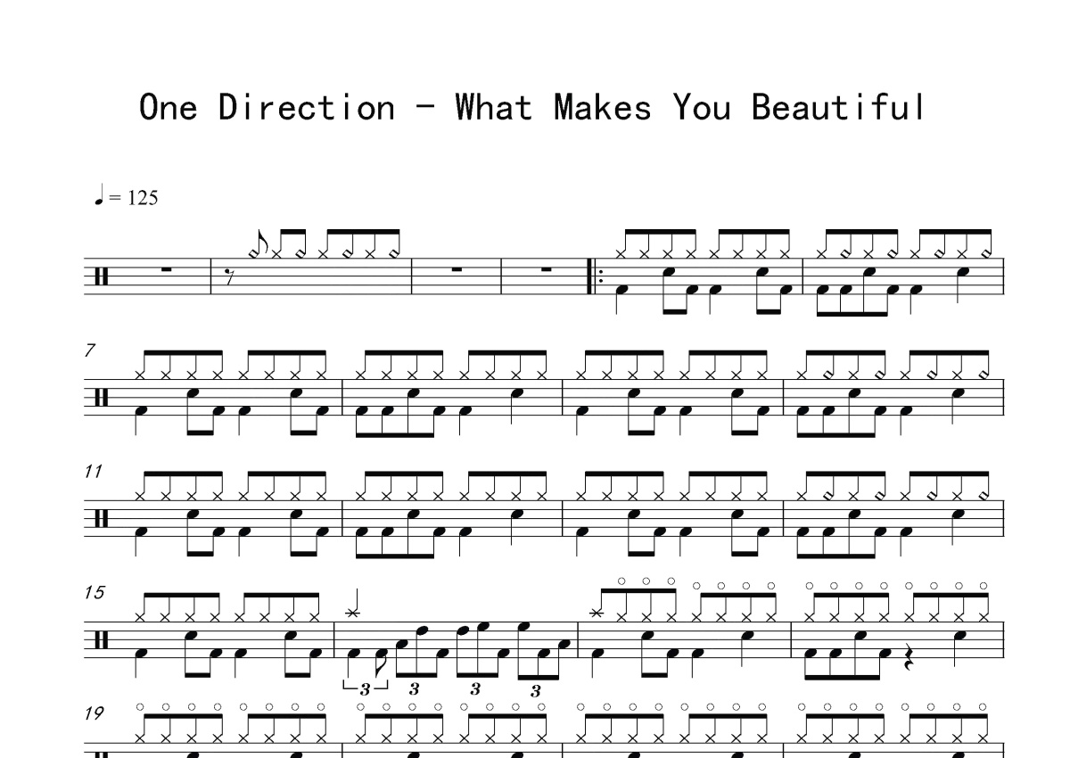 《What Makes You Beautiful》是One Direction演唱的一首歌曲,这份鼓谱共有两张高清图谱,图谱由 @打鼓谱 编配上传,图谱使用五线谱编配,使用这份What Makes You Beautiful架子鼓谱,你将能够轻松地敲打出这首One Direction的What Makes You Beautiful,快来尝试吧。One Direction What Makes You Beautiful架子鼓爵士鼓谱 附架子鼓伴奏曲,4/4拍节奏,每分钟125拍。
