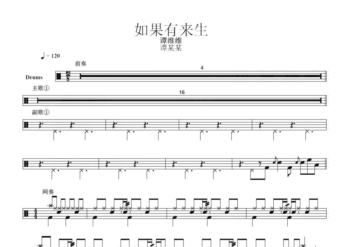 《如果有来生》是谭维维演唱的一首歌曲,这份鼓谱共有两张高清图谱,图谱由 @打鼓谱 编配上传,图谱使用五线谱编配,使用这份如果有来生架子鼓谱,你将能够轻松地敲打出这首谭维维的如果有来生,快来尝试吧。如果有来生(架子鼓谱)-谭维维。