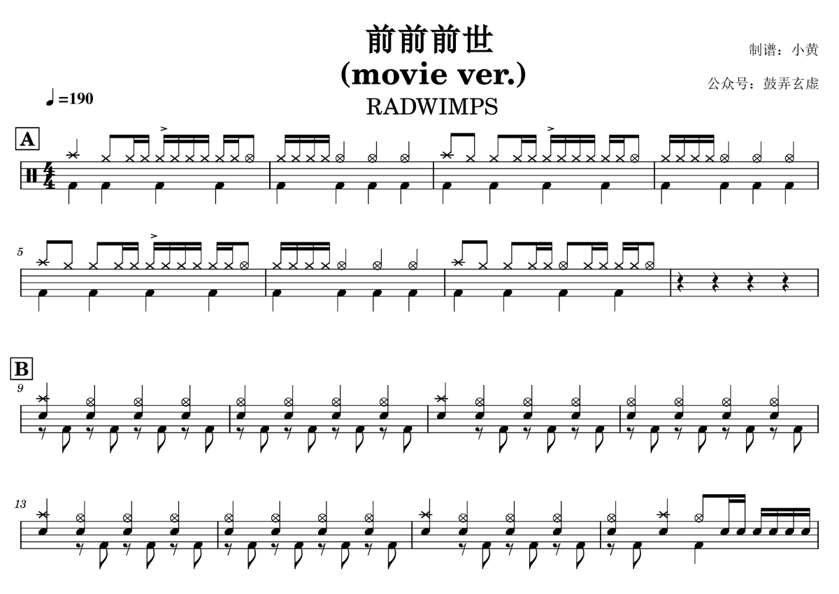 《前前前世 (movie ver.)》是RADWIMPS演唱的一首歌曲,高还原度,这份鼓谱共有六张高清图谱,图谱由 @小黄 编配上传,图谱使用五线谱编配,使用这份前前前世 (movie ver.)架子鼓谱,你将能够轻松地敲打出这首RADWIMPS的前前前世 (movie ver.),快来尝试吧。